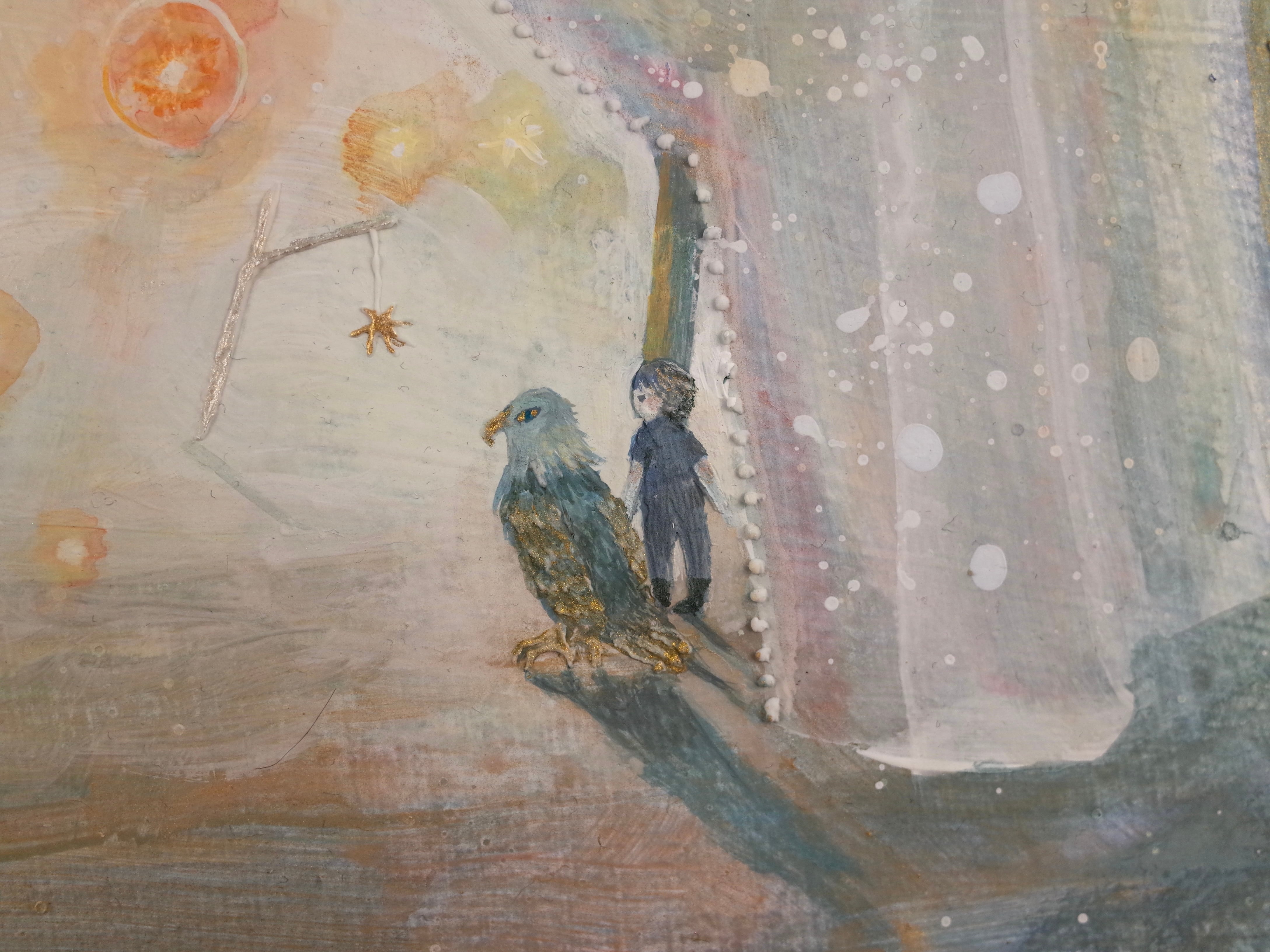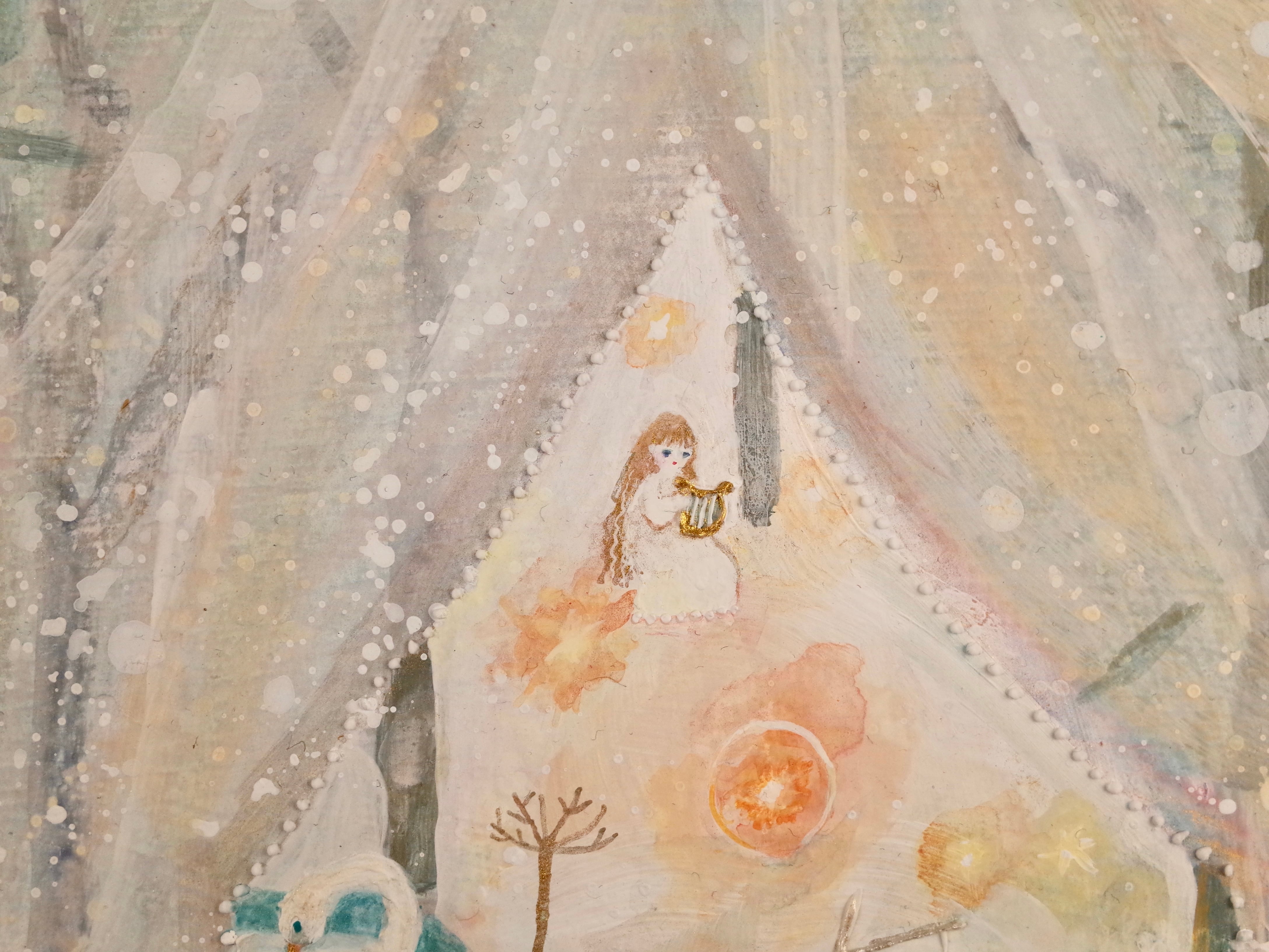 金色や銀色の絵の具を使っているので、見る角度や距離によってさまざまな表情に変化します。部分的にレリーフ状に盛り上げて描いているため、細い線や小さな物も不思議な存在感があります。