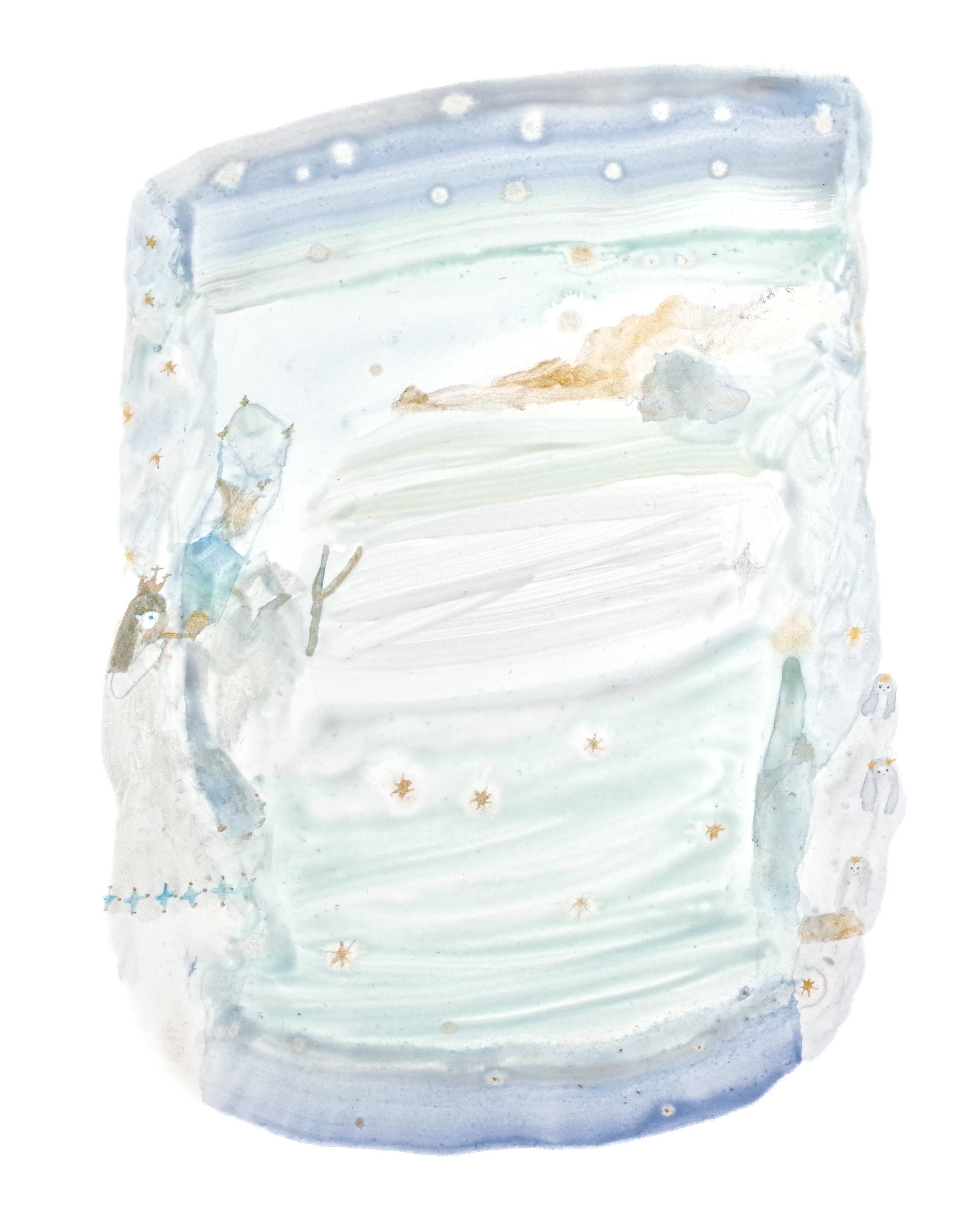 感覚的に乗せた絵の具から偶然生まれたにじみや形をじっと見ていると、いろいろなものが見えてきます。見えてきたものが絵の中で形になるように、手伝ってあげるようなイメージで描いています。