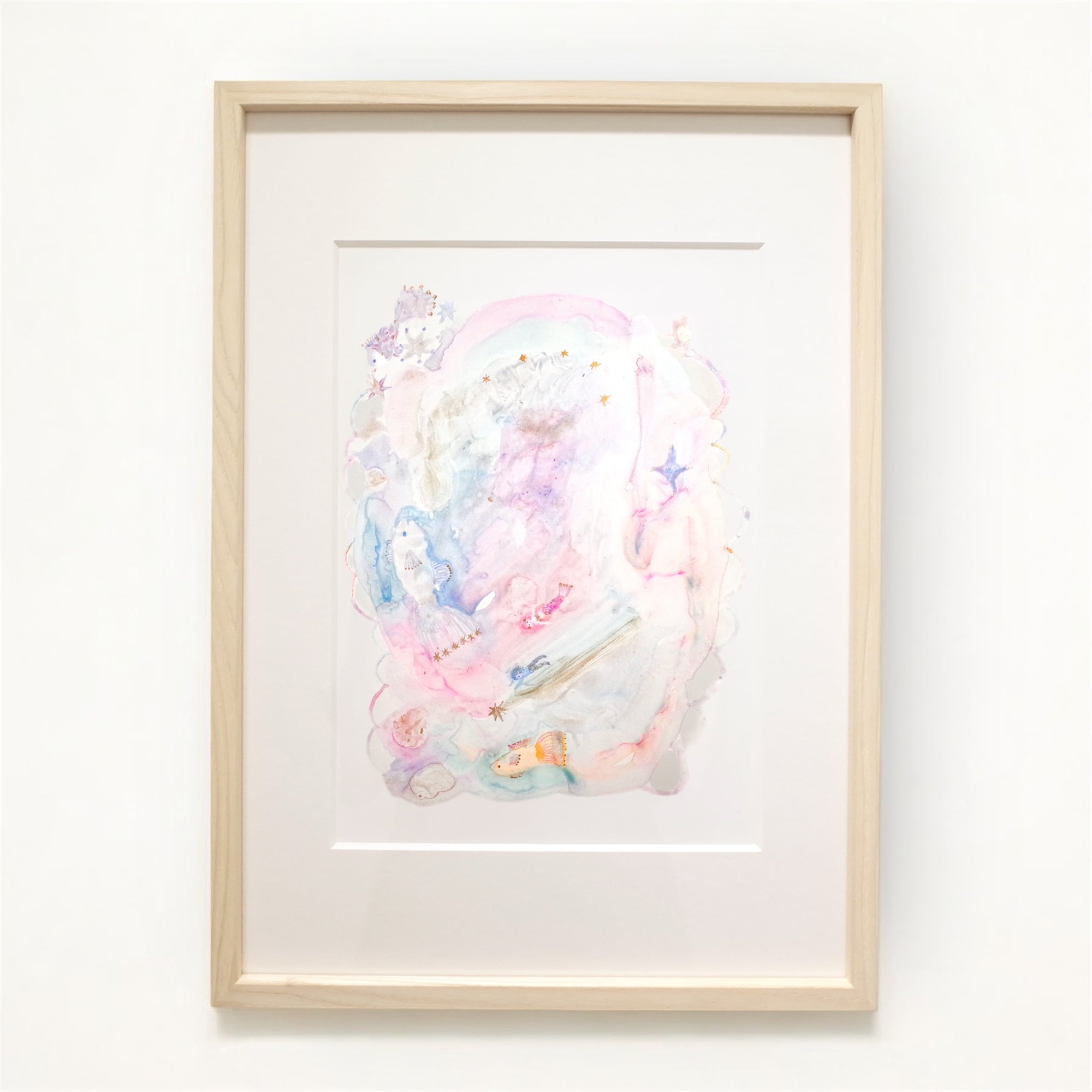 感覚的に乗せた絵の具から偶然生まれたにじみや形をじっと見ていると、いろいろなものが見えてきます。見えてきたものが絵の中で形になるように、手伝ってあげるようなイメージで描いています。